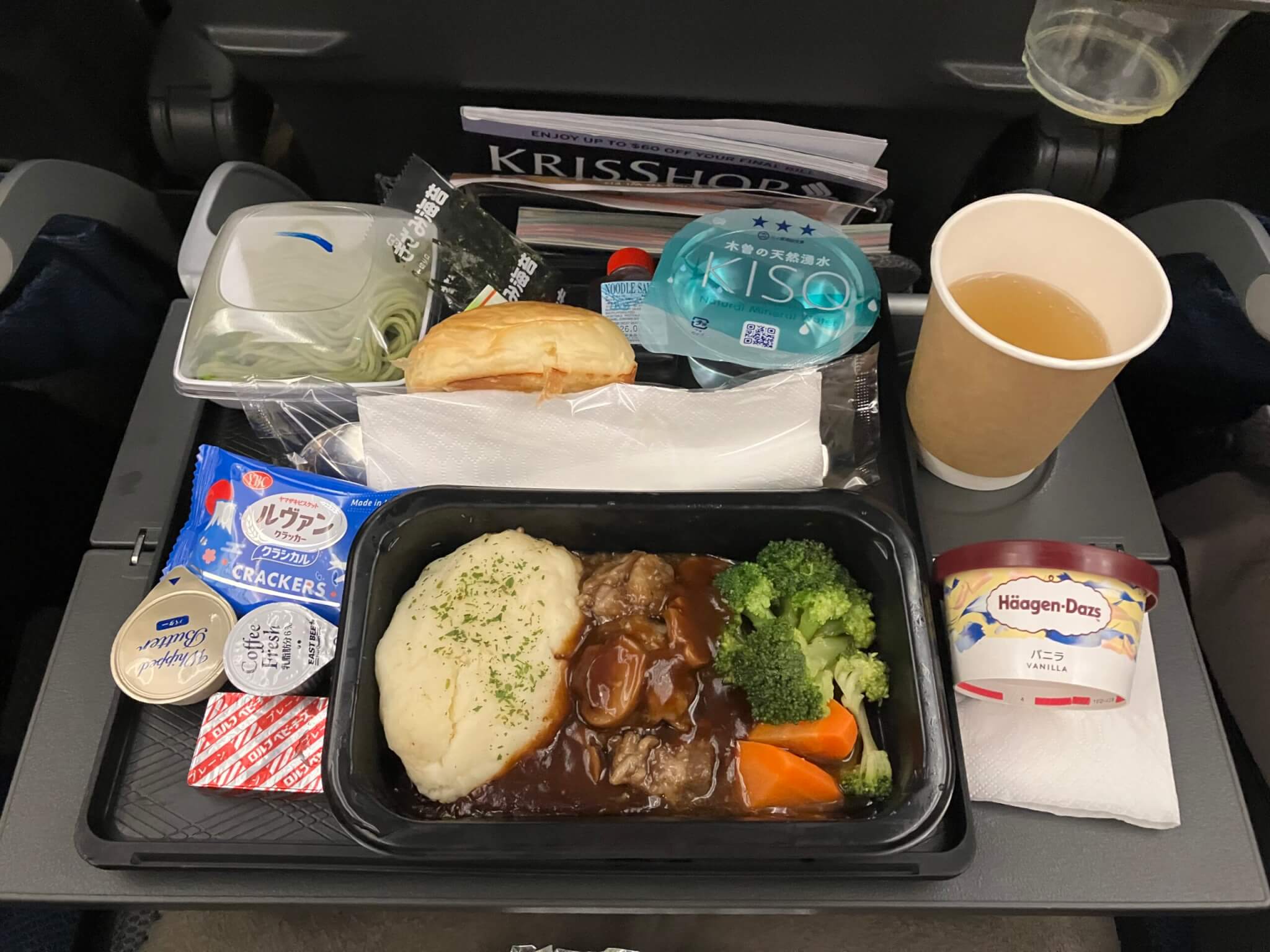 私は牛肉の機内食を選びました。お肉は柔らかく、ソースがたっぷりかかっていて美味しかったです。