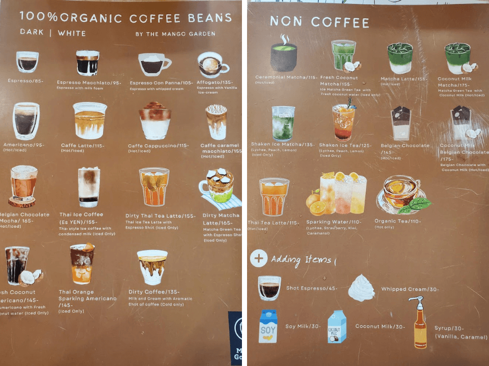 私たちはThe Mango Gardenで、ドリンク2品とスイーツ1品を注文しました。