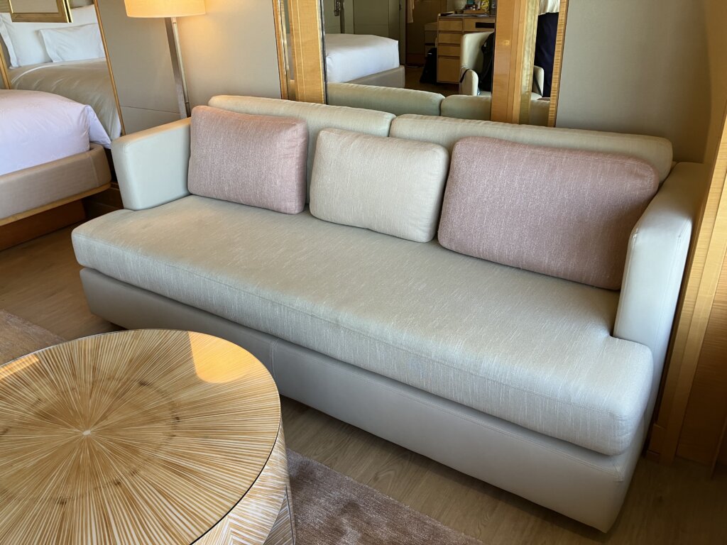 お部屋で飲食する際は、窓際にあるソファとテーブルを利用できます。美しい景色を眺めながら、ゆっくり食事や会話を楽しめました。