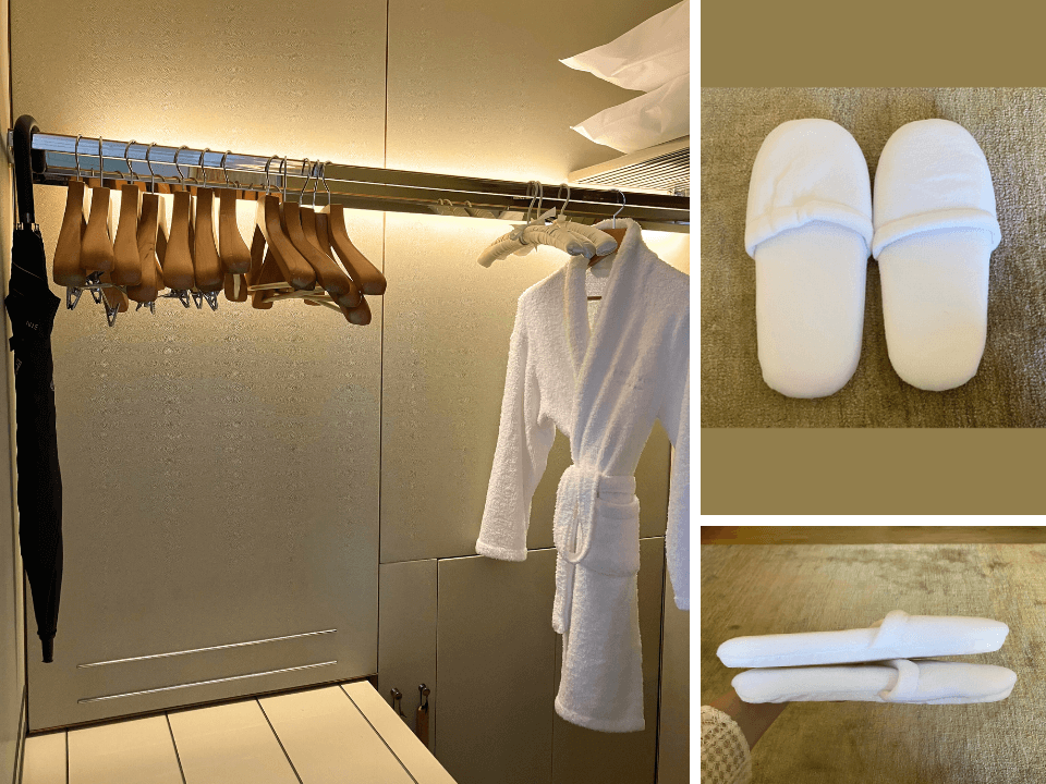 入口付近には、大きめのクローゼットがありました。棚の中に入っていたスリッパは厚手でふかふかしており、履き心地がよかったです!