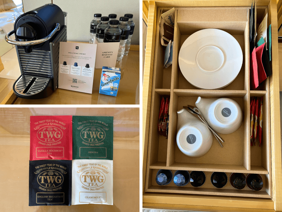 お部屋には、さまざまな飲み物が用意されていました。飲料水・コーヒー・TWGの紅茶・常温の紙パック牛乳などは無料でした。
