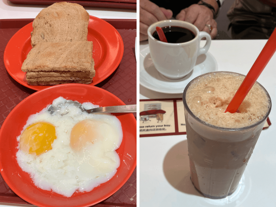 カヤトーストには薄いパンが使われており、カリカリに焼かれていました。温泉卵をつけて食べると、さらに美味しかったです!